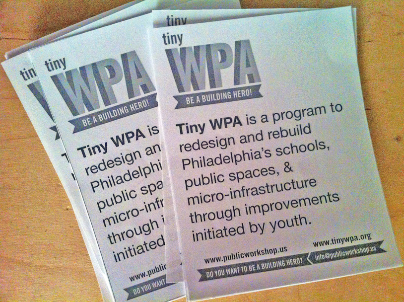 Tiny WPA is a program to redesign and rebuild Philadelphia’s schools, public spaces, and micro-infrastructure through design improvements initiated by youth. This program is inspired by the remarkable aspirations of Paul and RJ, two young adults from North Philadelphia. Blown away by the incredible community response they were getting simply by spending two hours rapid prototyping a bus shelter with me on a vacant lot on Germantown Avenue, they want to initiate a city-wide movement of community initiated civic design innovation. With the help of Paul, RJ, other neighborhood teens and a handful of young community-oriented designers, Tiny WPA will launch this Summer with the design-building of improvements to bus stops along Germantown Ave with our fantastic collaborators at the Village for Arts and Humanities.